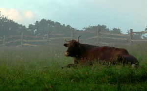 I’ve been chewing on this one for a while. A while back, I posted this photo to a weather site because I thought that it captured early summer morning mist in a thoroughly bucolic setting. It has the hand-hewn fence, the thistles, the Queen Anne’s lace and – of course – the cow (incidentally, an heirloom breed).