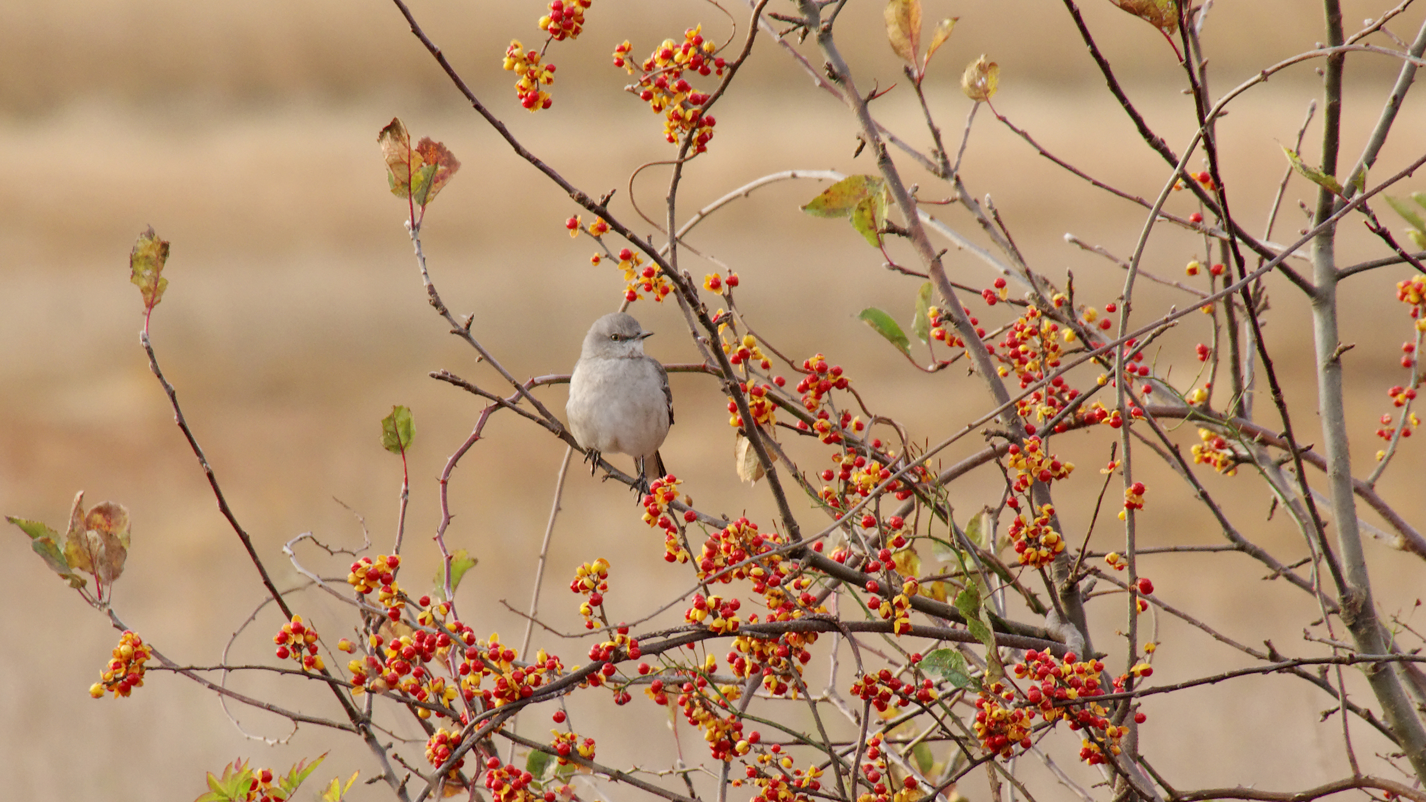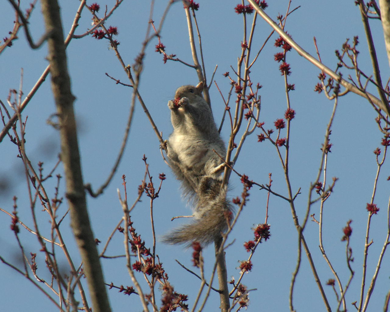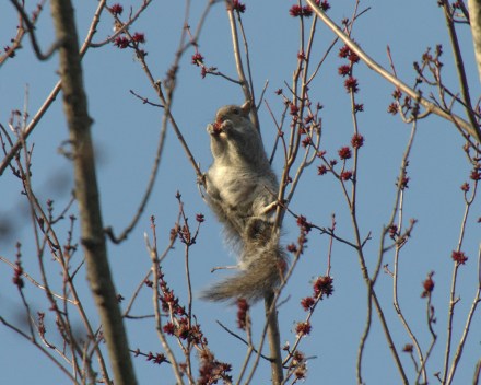 Thought I’d spotted a pretty good-sized bird in the treetops (I was on the lookout for a hawk), but it turned out to be this little guy who seemed very pleased with himself, stuffing his face with tree blossoms. He was sixty feet off the ground in the skinny branches – and a 12 mile per hour wind – but apparently so engrossed with the good eating that he wasn’t concerned.