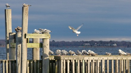 The gulls were hunkered down yesterday morning. The one who decided to give flying a try had a hard time landing.